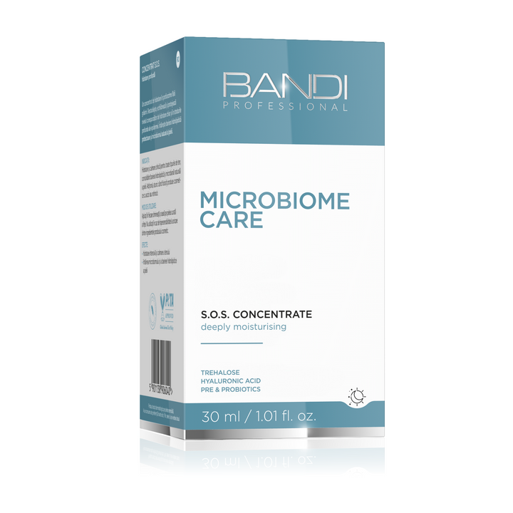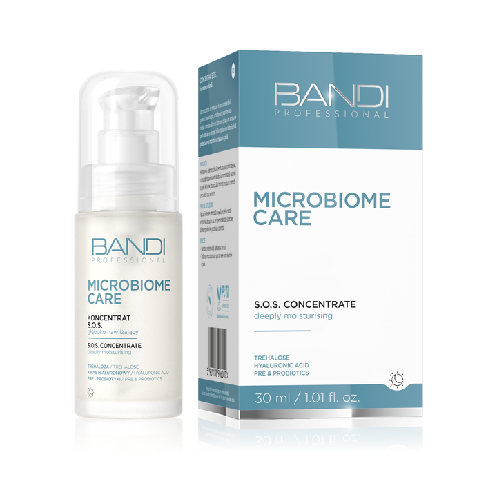 Microbiome Care Deeply Moisturising S.O.S Concentrate is an innovative rescue cosmetic for all skin types. Its advanced formula, enriched with hyaluronic acid, trehalose and pre- and probiotics, provides intense hydration, restoring comfort to even the most demanding skin. Its light texture is ideal as a make-up base, SPF product or skin care cream, without causing a feeling of heaviness or stickiness.