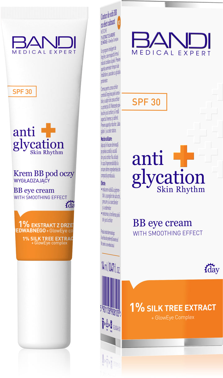 Anti Glycation Skin Rhythm SPF 30 is a smoothing BB eye cream from BANDI Cosmetics Poland, a trusted Polish skincare brand with nearly 40 years of experience. This innovative product combines UV protection with intelligent skincare aligned with the skin’s natural circadian rhythm. Enriched with 1% silk tree extract and the GlowEye complex, it visibly reduces puffiness, dark circles, and signs of fatigue around the eyes. The formula helps counteract glycation—a natural aging process that damages collagen and elastin, leading to wrinkles and loss of firmness. This eye cream smooths and firms the delicate skin around the eyes, restoring a youthful, refreshed appearance. It also protects against UV radiation, helping to prevent crow’s feet and static wrinkles. Ideal for those seeking comprehensive eye care that addresses aging, fatigue, and environmental stressors. As a new skincare product launch, it reflects BANDI’s commitment to innovation, effectiveness, and safe formulations. Whether used daily or as part of a targeted routine, this BB eye cream delivers visible results and long-term benefits. Product Benefits: