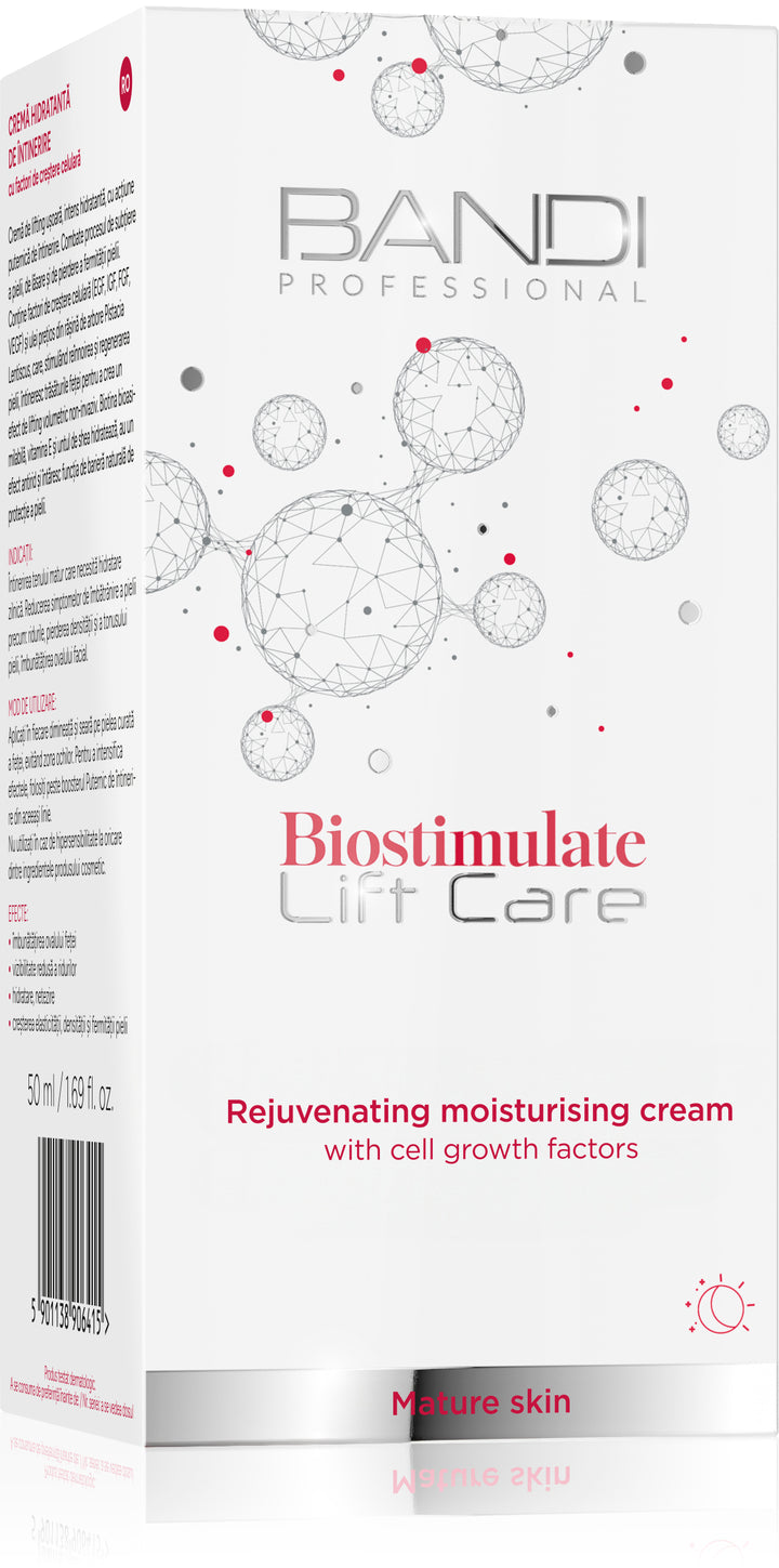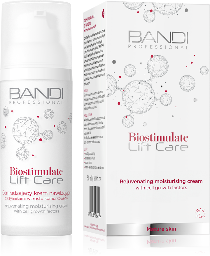 Rejuvenating moisturising cream with growth factors – intensive care with a lifting effect. Rejuvenating moisturising cream with cell growth factors is a modern approach to daily care for mature skin. Its innovative active ingredients, such as growth factors (EGF, IGF-1, FGF and VEGF), combined with biotin, phytoceramides and Pistacia lentiscustree oil , biostimulate and stimulate the skin to regenerate intensively. Regular use of the cream results in visibly smoother, more elastic and radiant skin, as well as an improved facial contour and a reduction in visible signs of ageing.