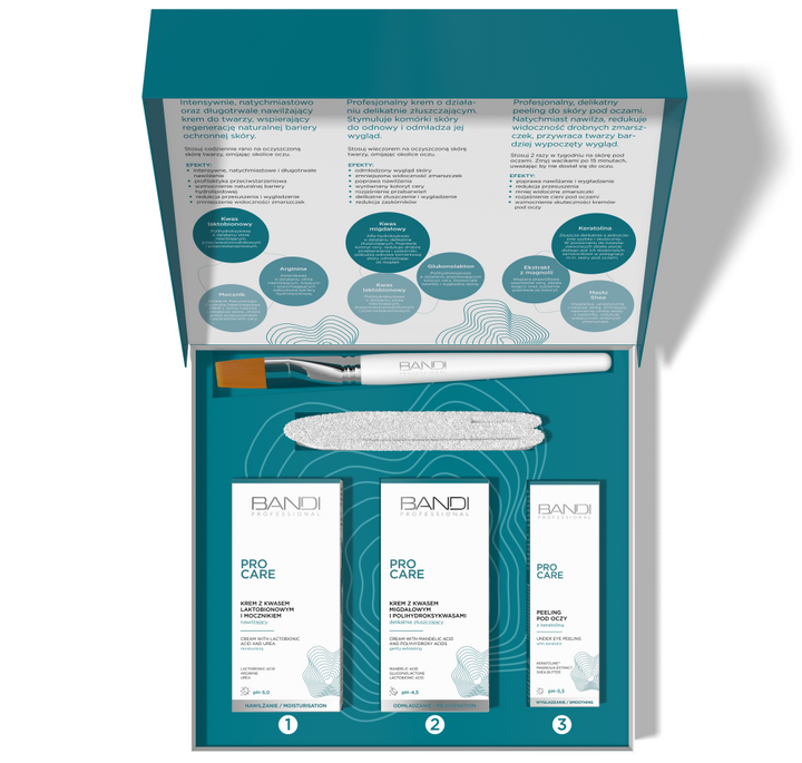 The PRO Care set contains cosmetics that strongly moisturise and "refresh" the skin tone, also under the eyes. It helps to remove the "grey, fatigued" look of the skin, gently exfoliating it to provide smoothness to the epidermis. Professional ingredients in home care are a recommendation both for those who appreciate the effectiveness of acids and enzymes, as well as for those who are yet to discover the extraordinary properties of these ingredients.